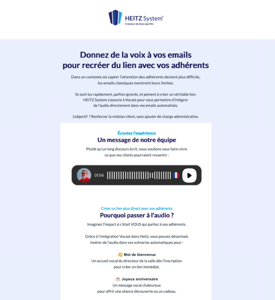 L’objectif ? Briser la froideur des emails automatiques. Grâce à cette connexion, les gérants utilisant Heitz peuvent désormais insérer des messages vocaux (gérant, coach, accueil) directement dans leurs campagnes d’emails, sans jamais quitter leur interface de travail.
