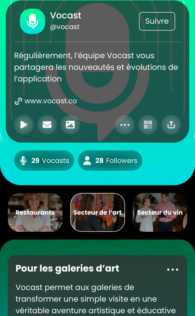 Sur votre profil Vocast, vos collections sont visibles et permettent à vos auditeurs de naviguer facilement entre vos contenus. Une façon simple et élégante de mettre en valeur vos vocasts et de captiver votre audience.